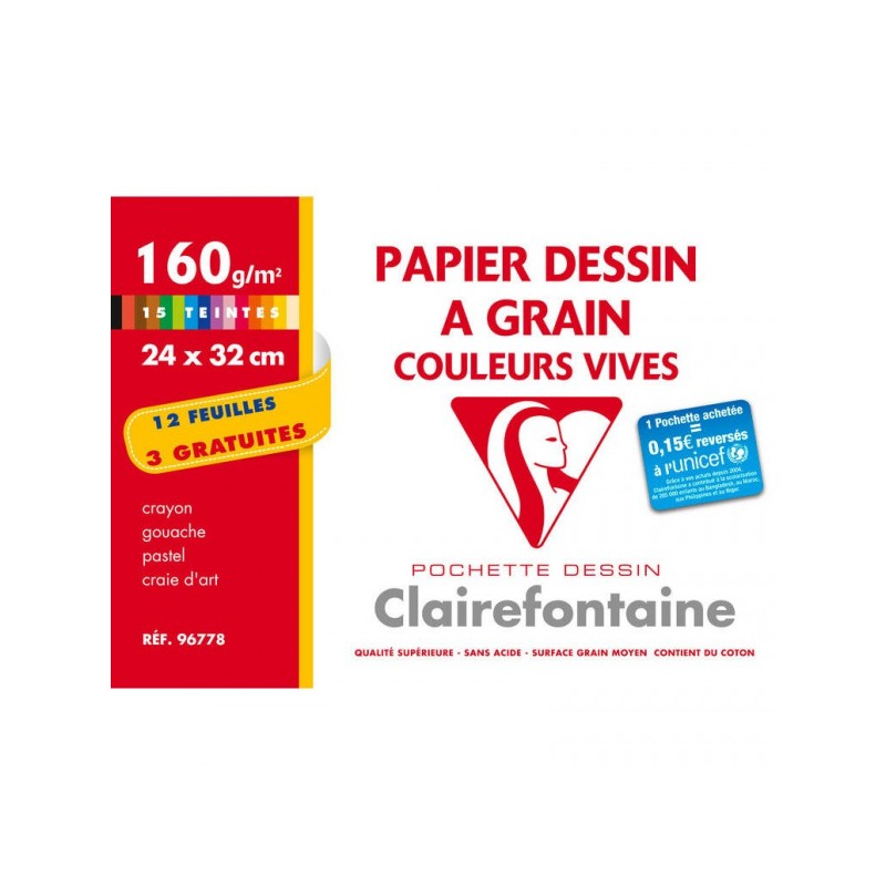 Papier dessin Clairefontaine assortis 160g, format 24x32cm, pochette de 12